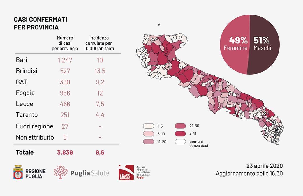Il totale dei casi positivi Covid in Puglia è di 3.839, così divisi: