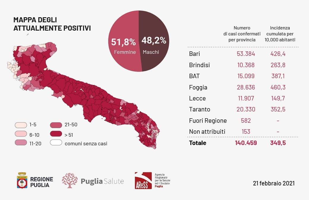 Il totale dei casi positivi Covid in Puglia è di 140.459, così suddivisi: