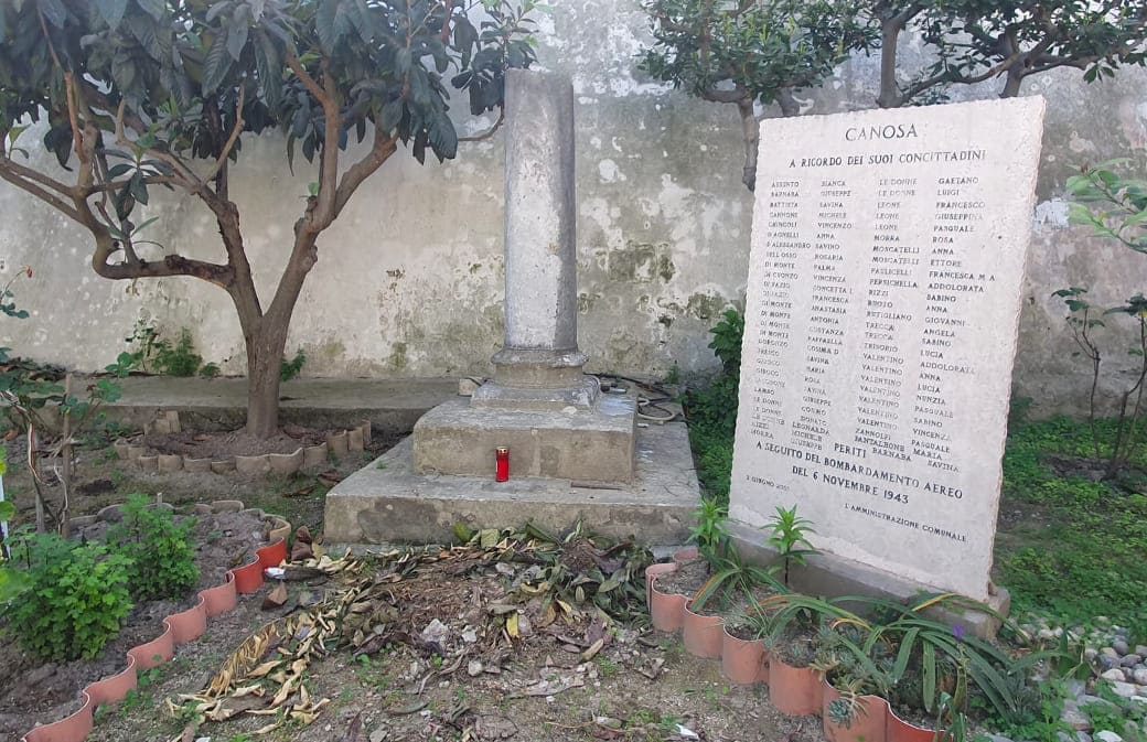 CANOSA DI PUGLIA - Un evento che ha contraddistinto una delle pagine di storia di Canosa di Puglia, che ancora oggi tutti rammentano e che alberga nelle menti di tutta la cittadinanza, è il tragico episodio del bombardamento del 6 novembre 1943, caratterizzato da un’azione militare tedesca. Un aereo sganciò sulla città almeno sei bombe che causarono quasi sessanta vittime. Luogo simbolico di questa strage è la piazzetta di via Salita ai Mulini, lì dove vennero rase al suolo le abitazioni di una delle famiglie più colpite dal bombardamento: la famiglia Valentino, nella quale persero la vita ben otto componenti del suddetto nucleo familiare.