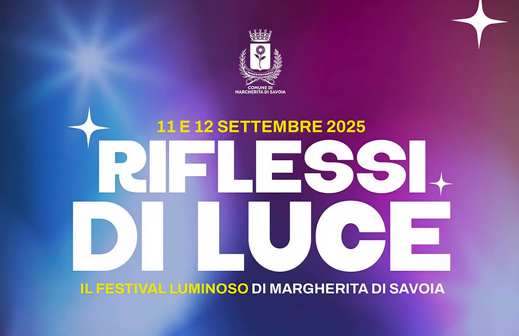 MARGHERITA DI SAVOIA - L’11 e il 12 settembre prossimi la città del sale ospiterà “Riflessi di Luce”, il festival che animerà vie, piazze e l’Anfiteatro Comunale “G. Piazzolla” con installazioni artistiche, spettacoli e concerti.