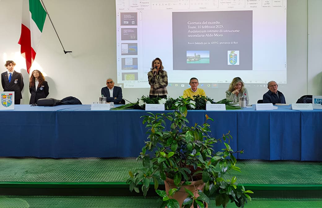 Nel corso della giornata, introdotta dai saluti istituzionali, oltre che del Prefetto, del Dirigente dell’Ufficio Scolastico Provinciale Giuseppina Lotito e del Dirigente Scolastico dell’Istituto Michele Buonvino, si sono susseguiti la ricostruzione storica del Presidente dell’Istituto Pugliese per la Storia dell’Antifascismo e dell’Italia Contemporanea, Vito Antonio Leuzzi, e la testimonianza di Rocco Saldutti, figlio di esule da Fiume e referente dell’Associazione Nazionale Venezia Giulia e Dalmazia, che con foto e immagini ha raccontato la storia della sua famiglia, la scelta di restare italiani e la difficoltà di uscire dai confini ormai ceduti alla ex Jugoslavia.