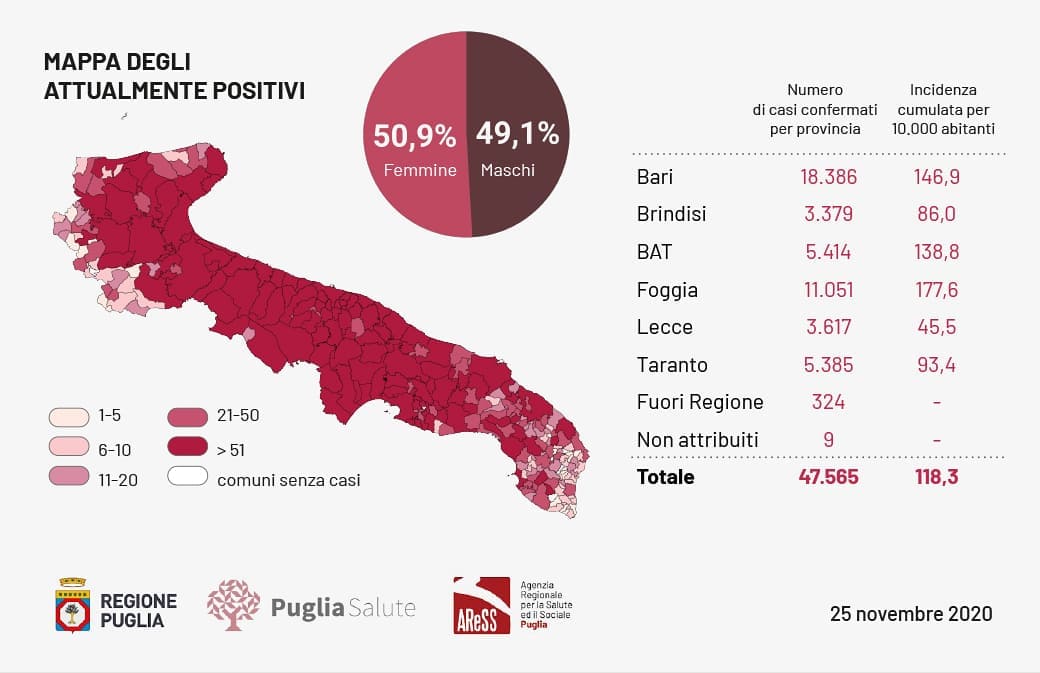 Il totale dei casi positivi Covid in Puglia è di 47.565, così suddivisi: