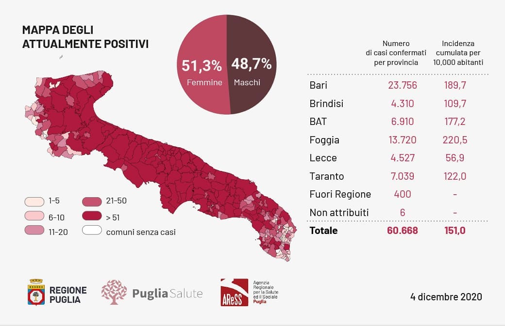 Il totale dei casi positivi Covid in Puglia è di 60.668, così suddivisi: