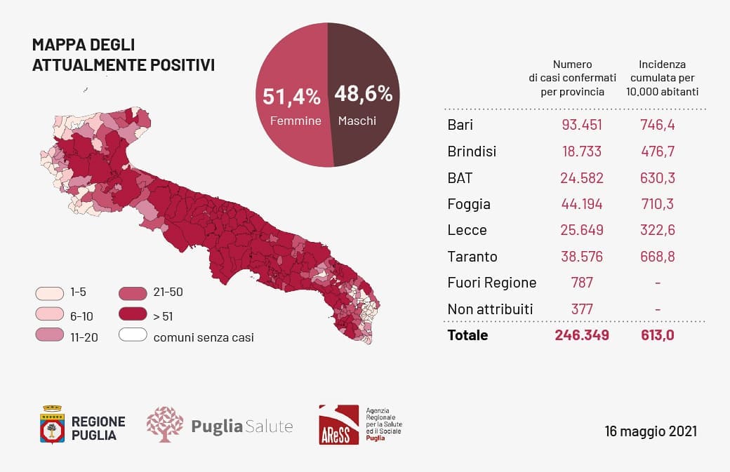 Il totale dei casi positivi Covid in Puglia è di 246.349 così suddivisi: