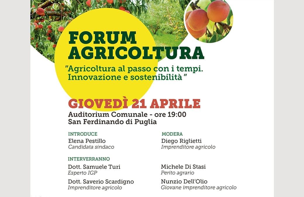SAN FERDINANDO DI PUGLIA - Giovedì 21 aprile alle ore 19:00, presso l’Auditorium comunale di San Ferdinando di Puglia, si svolgerà il FORUM AGRICOLTURA intitolato “Agricoltura al passo con i tempi. Innovazione e sostenibilità”.