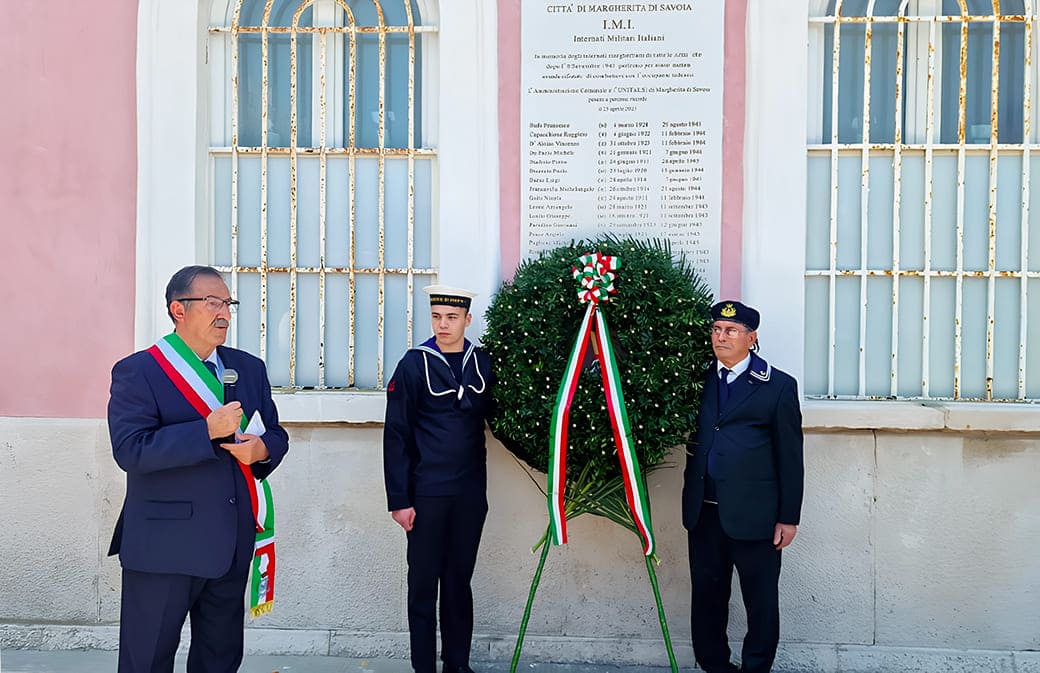 MARGHERITA DI SAVOIA - Francesco Bufo, Ruggiero Capacchione, Vincenzo D’Aloiso, Michele De Fazio, Pietro Diaferio, Paolo Di Corato, Luigi Durso, Michelangelo Francavilla, Nicola Gaita, Arcangelo Leone, Giuseppe Losito, Giovanni Paradiso, Angelo Pesce, Michele Pugliese, Vincenzo Ronchi, Michele Russo, Vitantonio Sardaro, Sabino Seccia: sono i nomi dei 18 Internati Militari Italiani originari di Margherita di Savoia e periti nei lager nazisti che da oggi, nell’80° anniversario della Liberazione d’Italia, campeggiano sulla lapide inaugurata sul lato est del Vecchio Municipio in Piazza Libertà.