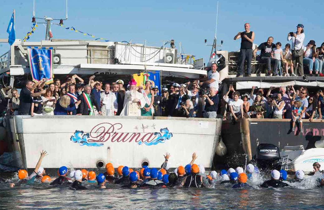 Secondo la tradizione il corteo partito dal centro cittadino si dirige verso il porto dove i presenti salgono a bordo delle imbarcazioni che si dispongono in cerchio a breve distanza dai moli; a quel punto il Vescovo impartisce la benedizione del mare secondo una antica formula in latino, la cui traduzione è: “Benedici, o Signore, tutto il mare Adriatico in cui i Cervesi e quelli che hanno affari con essi sono soliti navigare affinché in questo mare e in mezzo a loro sia sempre sanità, castità, vittoria, virtù. Benedici queste acque, le navi che le solcano, i remiganti, i nocchieri, gli uomini, le merci”. Molto suggestiva la parte seguente della cerimonia, in cui l’anello recante la data della festa viene gettato in mare per essere poi cercato e ripescato dai nuotatori presenti al rito. (Video, ndr)