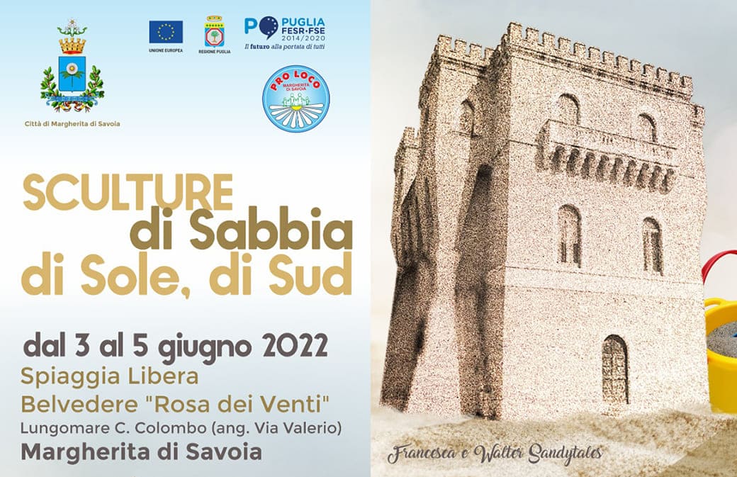 MARGHERITA DI SAVOIA - La rassegna “Sculture di sabbia, di sole, di Sud”, in programma da venerdì 3 a domenica 5 giugno, è l’evento che scandisce ufficialmente l’inizio dell’Estate Margheritana 2022. La manifestazione, organizzata dal Comune di Margherita di Savoia con il patrocinio della Pro Loco, rientra nei progetti di promozione culturale e turistica finanziati dalla Regione Puglia attraverso i Fondi Europei FESR-FSE 2014 ed è, come si evince anche dal nome, fortemente legata all’identità culturale del Mezzogiorno e alle tradizioni marinare della nostra comunità.