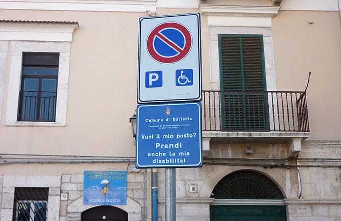 BARLETTA - Sono cominciati i lavori per l’installazione, in corrispondenza della segnaletica verticale indicante i posti auto assegnati ai disabili nei parcheggi pubblici, di pannelli recanti la dicitura “Vuoi il mio posto? Prendi anche la mia disabilità”. Gli interventi rientrano nell’ambito della campagna sociale di sensibilizzazione “Un gesto di civiltà”, che l’assessorato comunale alle Politiche della Sicurezza e della Mobilità ha inteso promuovere in collaborazione con la società Bar.S.A.