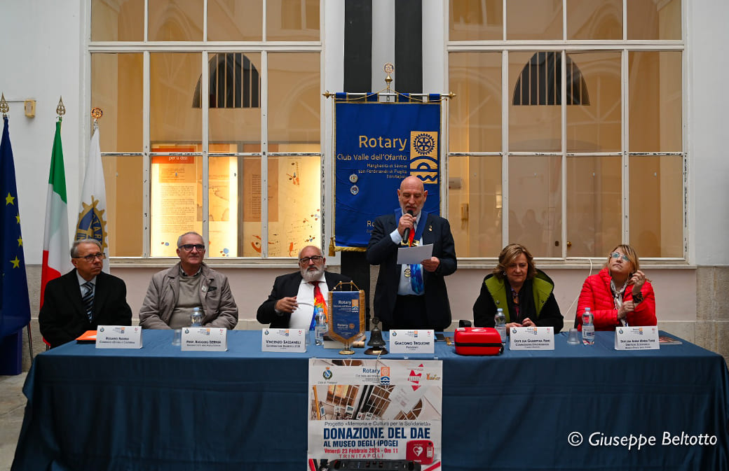 Si tratta di un defibrillatore che il Rotary Club Valle dell’Ofanto ha consegnato al museo in occasione dei festeggiamenti per il 119mo anniversario della fondazione del Rotary International. Il regalo è in linea con la “mission” di questa associazione di respiro mondiale che considera il servizio del dono “una azione disinteressata fatta per scaldare il cuore della gente, per farla sentire meglio e per diffondere serenità e amore”, come ha sottolineato nei saluti che il presidente del club ofantino, Gen. Giacomo Triglione, ha rivolto in apertura agli invitati Giuseppina Ferri, componente della Commissione straordinaria; Anna Maria Tunzi, direttore scientifico del museo e del Parco Archeologico degli Ipogei; Vincenzo Sassanelli, Governatore del Distretto del Rotary 2120; Rosario Manna, presidente di “Cultura e Memoria”; e Ruggiero Isernia, dirigente scolastico dell’Istituto Superiore “Dell’Aquila-Staffa”.
