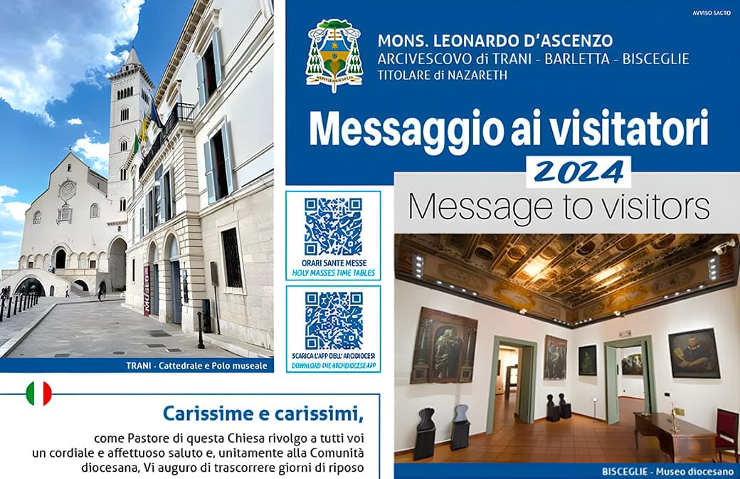 TRANI - In occasione dell’estate, che vede una significativa presenza di visitatori e turisti, l’Arcivescovo Mons. Leonardo D’Ascenzo ha voluto rivolgere loro un messaggio. Questo messaggio sarà diffuso attraverso diversi canali di comunicazione, inclusi quelli in lingua inglese. Di seguito il testo integrale: