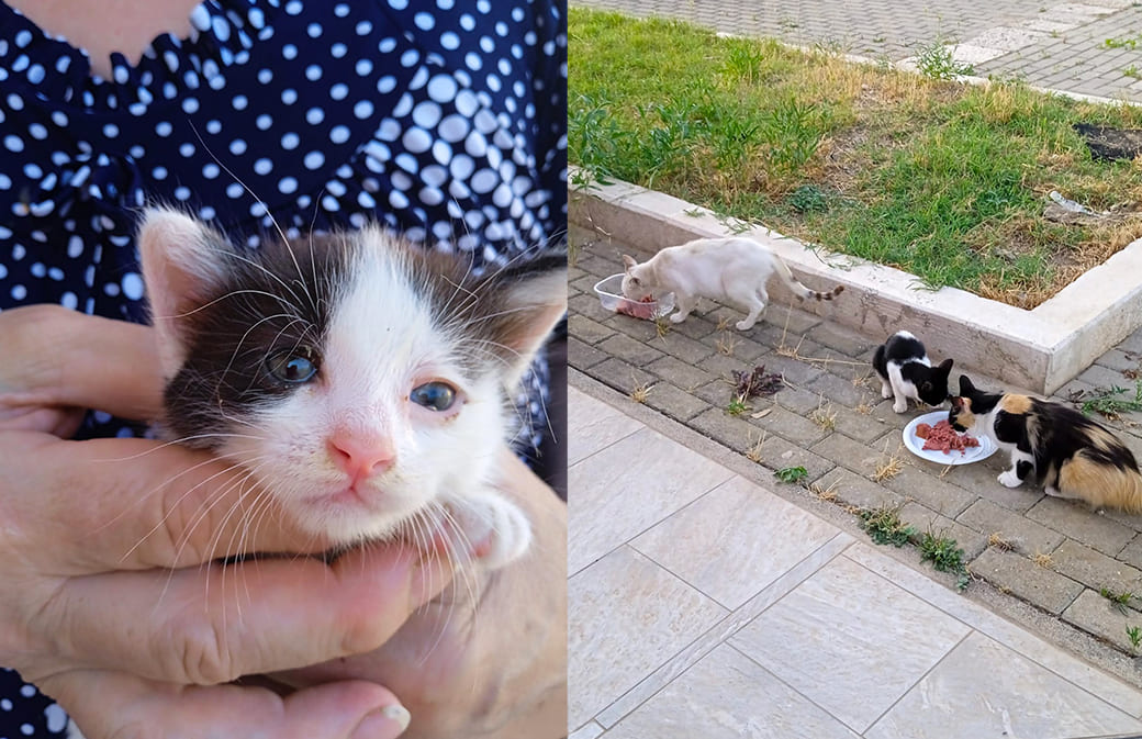 Ebbene, l’ultima nata, di circa tre mesi, di nome Stellina, nelle sue scorribande quotidiane si è allontanata dalla mamma Pallina ed è entrata in un piccolo foro di una casa murata. L’entrata è stata facile ma l’uscita impossibile. Ha cominciato a miagolare all’impazzata sia lei che la mamma, di guardia al foro, in ascolto della figlioletta. Il cielo ha voluto che la signora Barbara abbia sentito il miagolio disperato e si sia subito resa conto di quanto fosse successo.